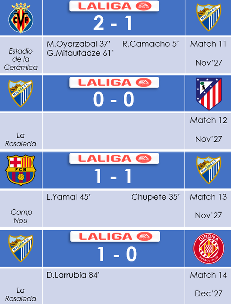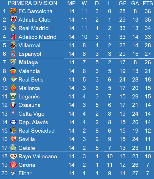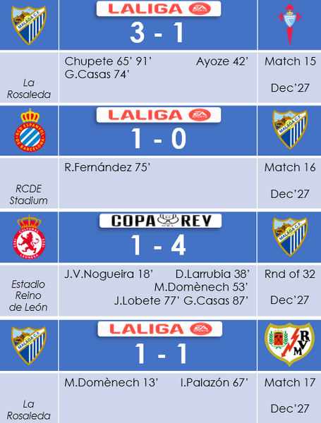 Unbeatable against the top twos with two draws and a win against the Elite of Laliga. Sitting in the top six the team must be delighted with their start over achieving for sure that rock solid defence playing a crucial role the aim was avoid relegation now anything below a top ten would probably be a disappointment for the team. 8 Goals for Chupete isn't a terrible return for his first season in Laliga at this stage I'm sure more goals will come as he settles to the pace of it