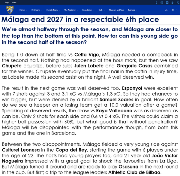 Disappointing result against Bilbao but they are a great team and it is a big ask to go there and get something. The team bounced back well with back to back wins but a disappointing draw against Girona. Interesting that you say the team apears better without Chupete maybe Ethan Mbappe can get more out of him a great loan signing with a lot of potential does his brother fancy playing 6 months with him :P