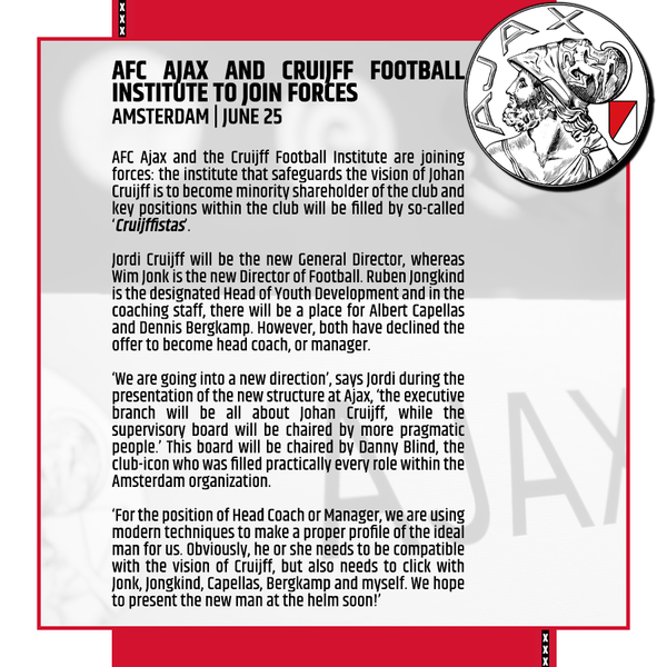 In late 2010, after six seasons without a league title and declining results on the European stage, Johan Cruijff decided to step up at his home club AFC Ajax. Under his influence the tide was turned almost instantly. Four consecutive league titles under manager Frank de Boer were the precursor to international success under successors Peter Bosz and Erik ten Hag. Moreover, the club returned to its core values such as a focus on youth development, typical total football style of play and key positions in the club filled by people with so-called Ajax DNA.