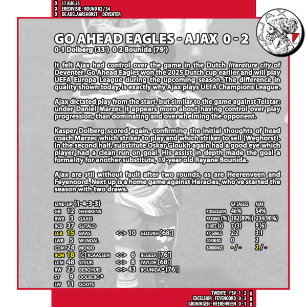 Farioli wanted to continue, but on his own terms and that was incompatible with the Ajax culture that emphasizes home-grown talent and the attractive and attacking concept of total football. Thus, Farioli departed. Club management are putting their jobs on the line and their future in the hands of the unexperienced manager Daniel Marzec, who is expected to at least do as well as his predecessor: qualifying for UEFA Champions League and decent runs in Europe and in the Cup.