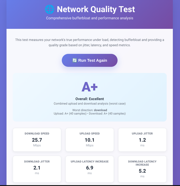 Hier mal 2 verschiedene Bufferbloat Tests . Einmal der von dir geforderte "Github" und einemal der von "Waveform" die Werte sind fast Perfekt ! Das sagt schon alles