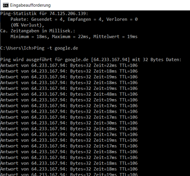 Mach eine Konsole auf (CMD.EXE) und ping einen Host (Ip-Adresse / DNS-Name) im Internet an,