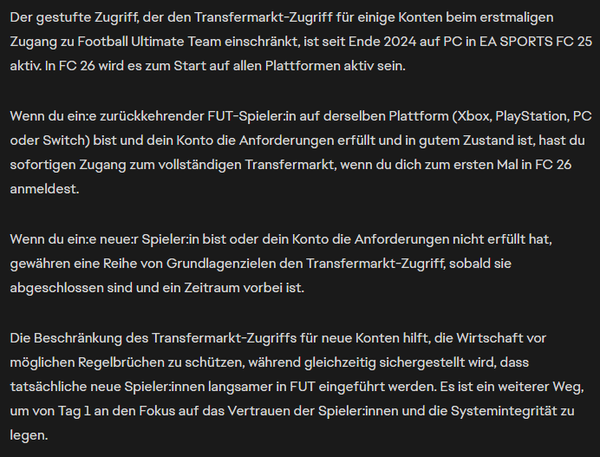 die Meldung, welche du erhälst, hat etwas mit dem gestuften Zugriff zu tun, welcher in FC 26 eingeführt wurde. Du kannst mehr dazu hier im Deep Dive unter "Gestufter Zugriff auf den Transfermarkt"  finden.