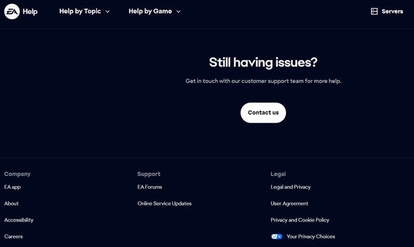 Go to the top of the page and select “Help by Game,” then choose FC26 on the next page. Scroll all the way down and click “Contact Us.” Please note that it can be quite difficult to reach a live agent (As you've already noticed). In most cases, you will first be directed to a chatbot, but after a few attempts, you may eventually be connected to a human representative.