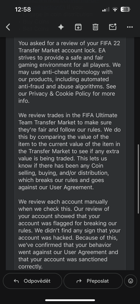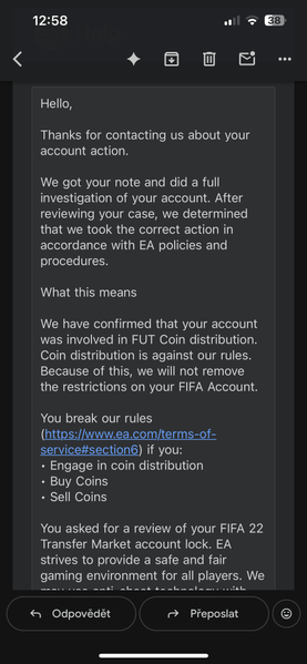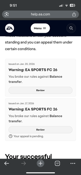Right now the situation is that they denied my appeal on first ban and told me I broke the rules only. I haven’t received any form of proof or explanation which is very annoying as I would like to know what illegal activity have I done because to my full concern I haven’t done anything illegal and I haven’t been part of transferring, selling or buying coins ever in my life. Also another eyebrow raising thing is that in the email I received for my appeal was stated that it was reviewed my FIFA 22 account. My appeal was against ban on EA FC 26 and I haven’t even played FIFA 22 for 4 years.