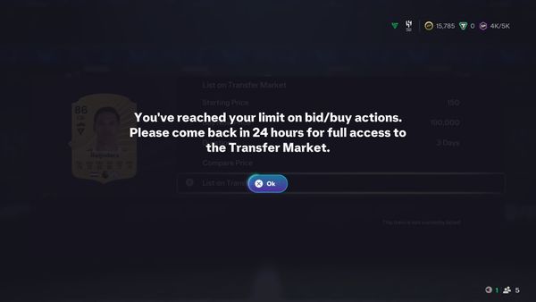 "You've reached your limit on bid/buy actions. Please come back in 1 Day 23 Hours for full access to the transfer market."