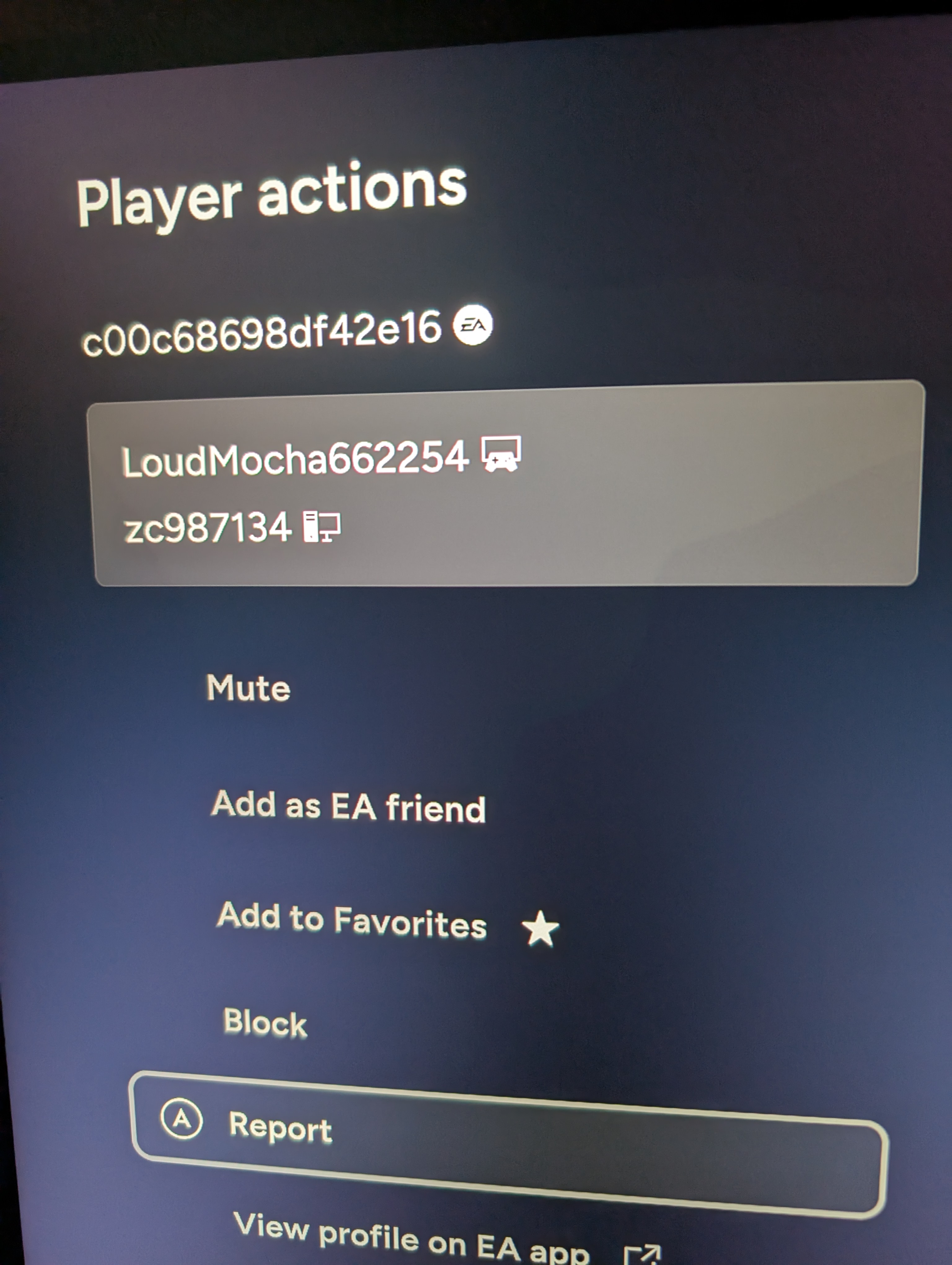 I just played a hack in rivals there is no way to report him for hacking through the game just offensive name thing ea you need to add an option to report hacking ive attached a photo of his profile