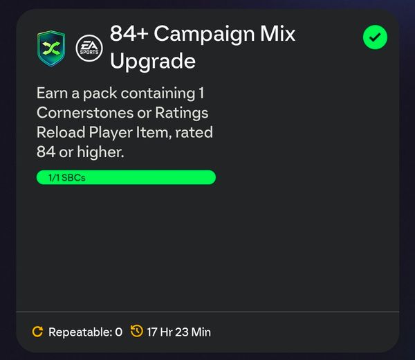 "Earn a pack containing 1 Cornerstones or Ratings Reload Player Item, rated 84 or higher"