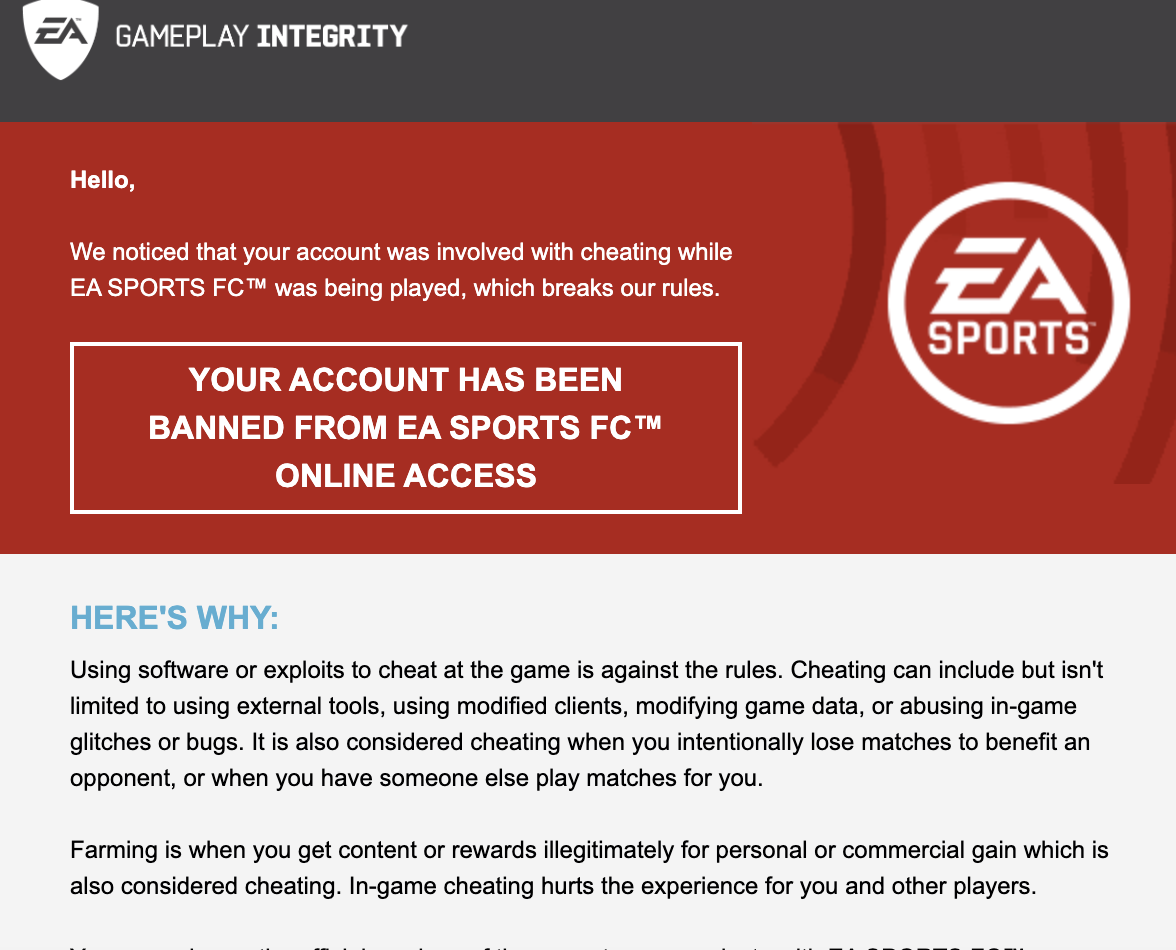 It's so weird that I just go randomly banned for no reason during a early stage of game play, I'm have playing this game since 2019 for playing FC games, I have done nothing that against the rule of the game, no buying coins, no cheating with third party modification, I don't even know what I did that would cause getting ban. As I mentioned, I was using a avg 60 rated team with all chinese football player to play DR, where I lost the game, but scored few goals with a wonderful player, this is the only thing that I can think of the reason of bans, where this could consider as large gap betweem team overall avg, I got notifications of account banned right after the game finished. I have played either FIFA and FC for many years, every generation, I believe with my skill, scoring goals with new great stauts future player is reasonable, I have absolutely no clue why u banned me instead of sending him an email saying “ u should be better”. I being spending tons of the time on the new FC26, where I loved the games and all the new changes, it's really unfortunately to see this happened, I felt really upset from EA group, I'm sorry if there is any misunderstand between this case, it's quite unaccpectable this happen, I have submitted multiple cases, and it never reply back...