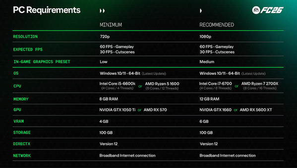 A continuación detallaremos los requisitos mínimos y recomendados para poder ejecutar correctamente EA SPORTS FC™ 26 en tu PC.