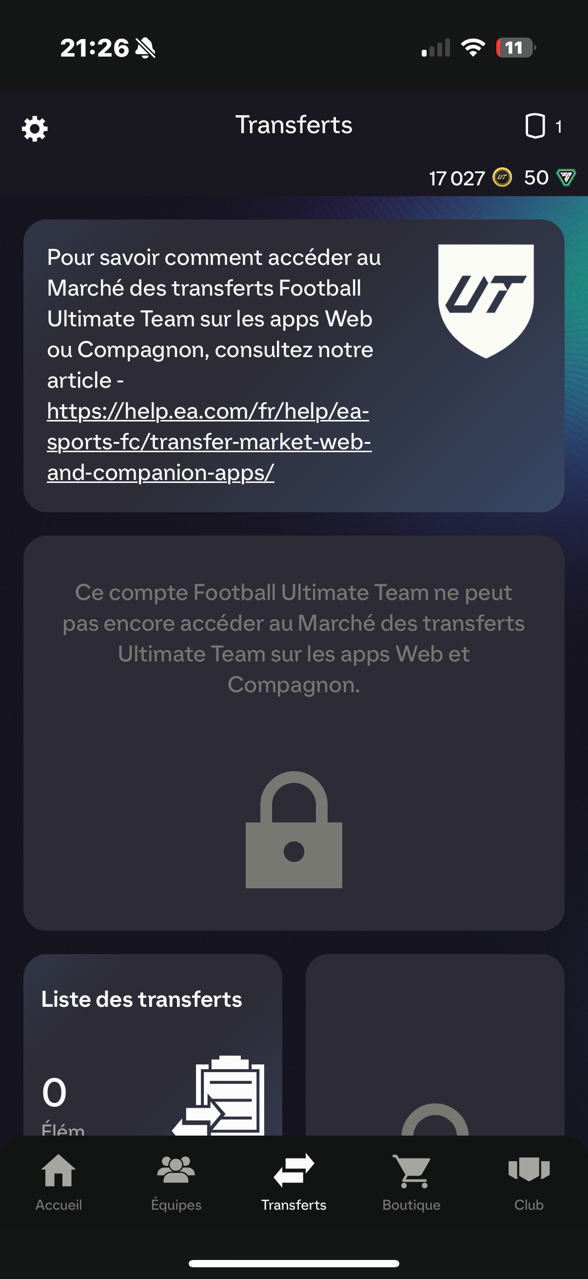 Bonjour liliancorreas , si vous n'avez pas encore accès au marché des transferts il faudra continuer à jouer quelques matchs depuis la console. Cet article vous donnera aussi plus d'informations à ce sujet: Accès au Marché des transferts d'EA SPORTS FC™ sur les apps Web et Companion