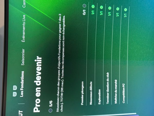 Dans les objectif fc 26 « les fondations » je complète « pro en devenir » qui demande de terminer tout les groupe d’objectif fondations mais après avoir fini « exploration » j’ai eu les récompense et la validation mais dans « pro en devenir » il n’es pas afficher comme remplis ce qui m’empêche de recevoir les récompense final HELP