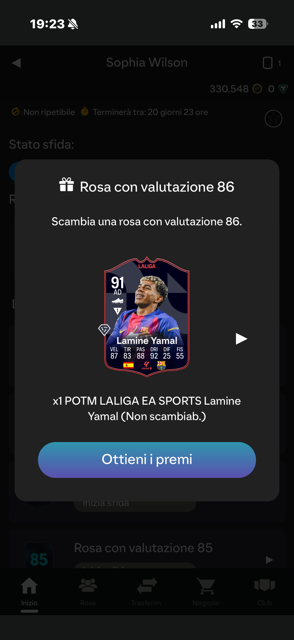 Ho completato La Rosa 86 di Wilson sbc, dove come ricompensa c’era Yamal 91. Non mi è stato assegnato.