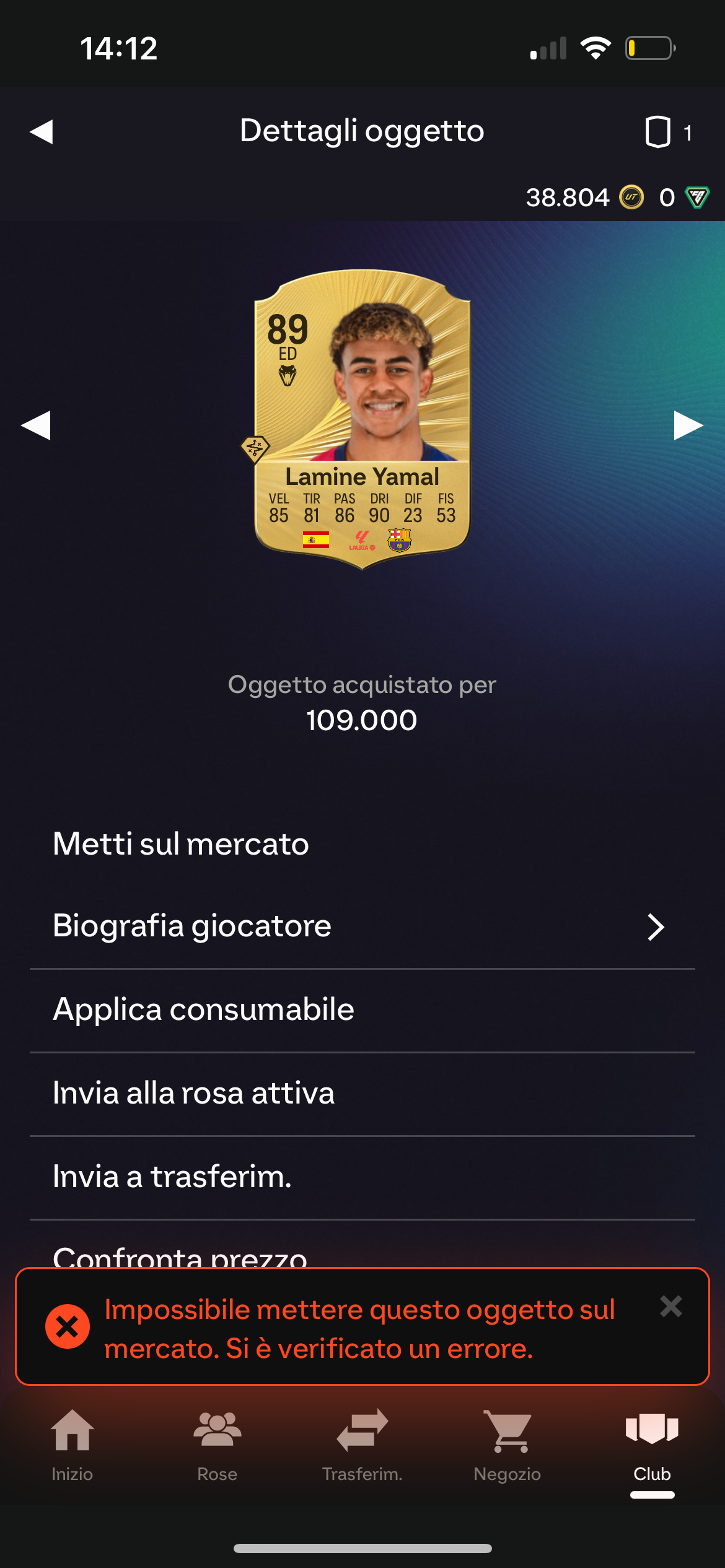 ricevi un errore anche quando provi a vendere questo giocatore dal mercato trasferimenti in gioco sulla tua piattaforma, piuttosto che dalla Companion app?
