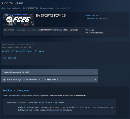 11 hours agoOla M1iwnl_FC Como a transação é realizada pela Steam, a EA não tem acesso a esse pagamento e, infelizmente, não pode realizar reembolsos de compras feitas por meio de outra plataforma.
