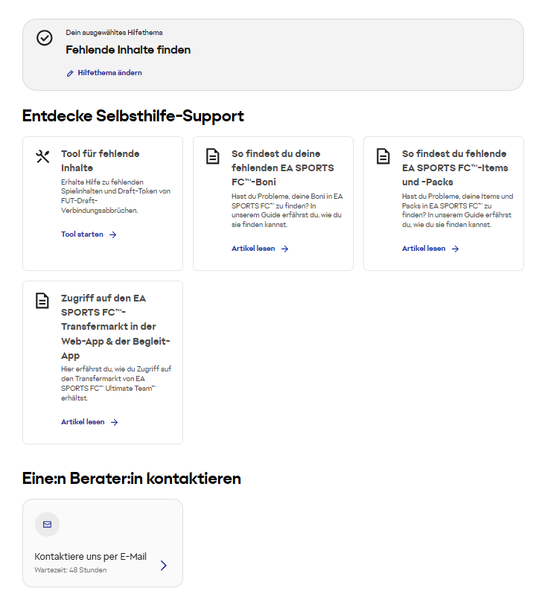 Sieh unter @EASPORTSFC und @EAHelp nach, ob es Updates oder News zu deinen fehlenden Inhalten gibt.