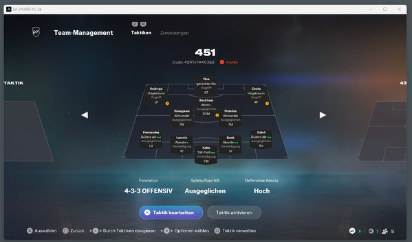 ich brauche dringend eure Hilfe! Kann mir jemand erklären, was mit meinem Spiel los ist? Ich habe drei verschiedene Taktiken für mein Team eingestellt: 4-5-1, 4-3-3 und 4-3-1-2. Abgesehen davon, dass das Gameplay seit Tagen furchtbar ist, ändert mein Spiel ständig die Einstellungen. Ich starte ein Rivals-Spiel, spiele ein paar Minuten und möchte dann meine Taktik ändern. Irgendwie merke ich, dass sich das Team nicht anpasst. Ich pausiere das Spiel und versuche, die Taktik im Menü zu ändern, und plötzlich sind alle drei Taktiken auf 4-3-3 eingestellt. Wie kann das sein? Gestern wollte ich Spieler auswechseln, aber es ging nicht.