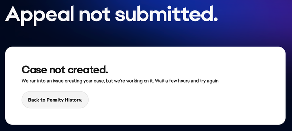 After I found this ban, I immediately went to EA HELP and intented to submit an appeal, only to find that it turns into "Case not created" agian and agian, as attached.