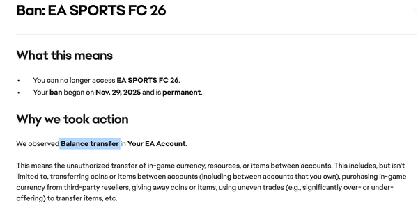 My account was suddenly banned from fc 26 for "balance transfer" - an accusation I have never ever done before. Actually I seldom used the transfer market this year, not to mention transfer coins to/from other accounts, so I can gurantee that this ban is purely a ridiculous mistake.