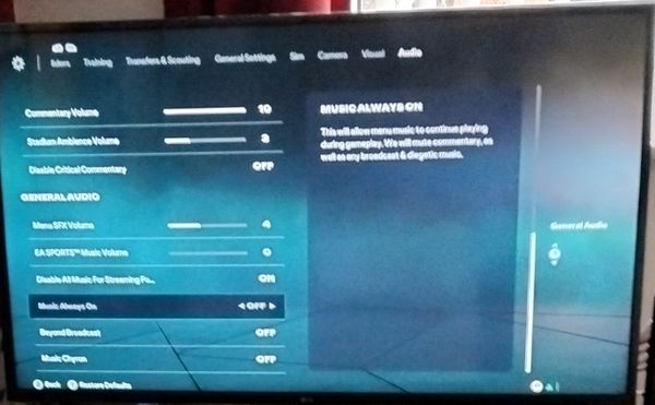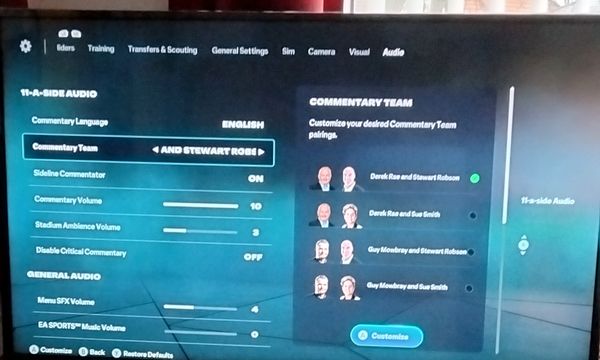 no problems with any setting apart from comentry audio, it is non existant although all other sounds work fine, music, stadium ambiance, attached screen shots of the audio settings,