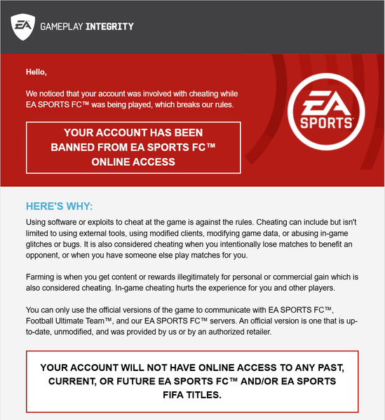 The situation is that my account was banned on 16 Jan. The reason is that I have cheat the game. and I got a email about that I break the rules. After I appeal my account, EA check again and give me a reason about my account is banned again. I never break any rules in EAFC. This is ridiculous, and EA is the rude robber in the area of football game. They even can not give me any evidence. All of this is ridiculous. They just rob my money easily without any reason. What a technology they have! I don't cheat any game in EAFC26 and I have pay a lot in this game. I still got unfair treatment in this game. please hire someone normal and fire HR.