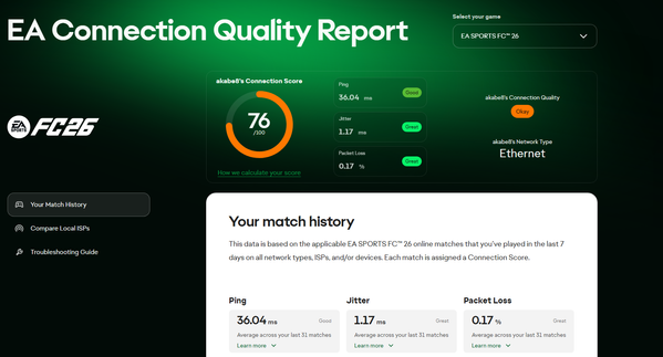 Hey there. Thanks for reaching out. We should go through some connection troubleshooting. First, I'd like you to run the Connection Quality Report and get me a screenshot of the overall score as well as the match history. You can find the button for that on the left side of the screen.