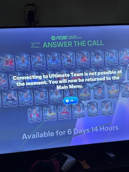 Can’t connect, tried everything, logged in on web, changed squad etc, changed dns and all that, used my starlink, router etc, nothing changed, restarted lots of times, I can play seasons and clubs but can’t play/open ultimate team. Says can’t connect to ea team ultimate team bla bla bla