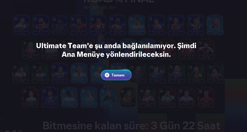 I'm logging into FC26, everything's fine up to this point. EA is active, when I press R2 my friends appear while playing, then I click on Ultimate Team, it updates the roster and everything, but then suddenly when I try to log in, it says "Currently unable to connect to Ultimate Team. You will be redirected to the main menu." What solution can I use? Please help.