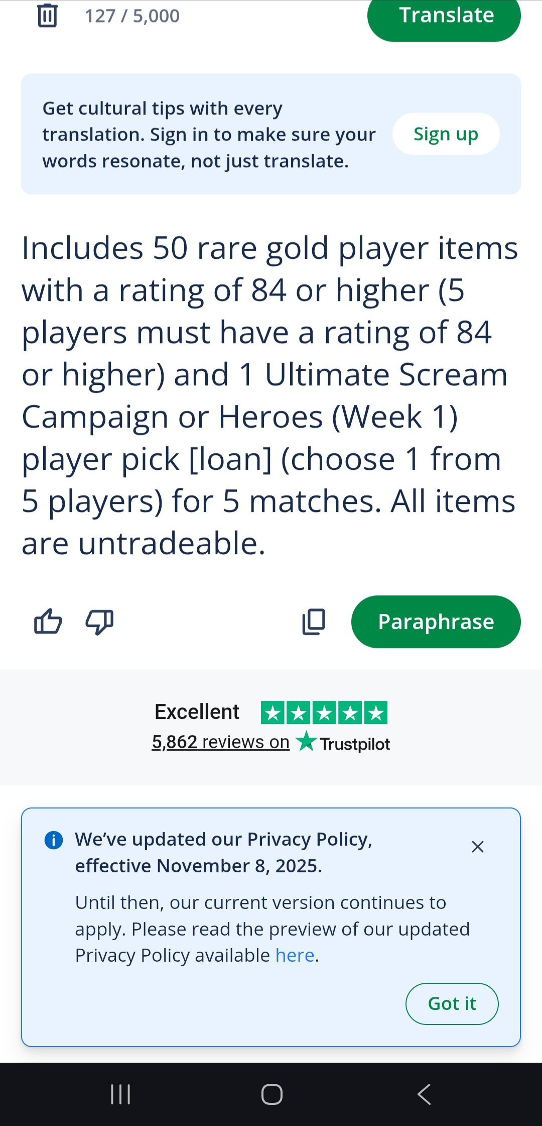 I opened 3 store Packs when UT Scream dropped with a description that said " Includes 50 rare gold player items with an 84+ rating or higher (five players must be 84+) and one Ultimate Scream Campaign or Hero (Week 1) Player Pick [Loan] (choose one of five) for five games. All items are untradeable." i only received 5 +84 guaranteed from each of these 3 packs and every other player was below the 84+ rating which i paid with using FC Points i brought with real money, I was expecting each pack to give me 84+x 50 rare gold player items as stated and i got aload of players below the rating of 84+, stop closing this case as im just going to keep reopening it and eventually will pursue actual legal action against you stop sending me the email that says "We’ve looked into your case, and you’re not eligible for any more content. This can happen if you didn’t earn your content in time, or you didn’t meet a reward’s requirements", not only was this content im missing, Earned in time it was brought with my real money I want my 3 84+x50 packs, I noticed from what others told me to that the description got changed awhile after I opened the packs, so something was definitely wrong and you acknowledged it by changing said description, I want the content I Earned and paid for, and im sure alot of other people here too have been wronged and want the content they Earned and paid for too.