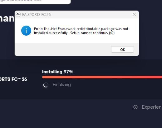 5620233092b9636aNewcomer16 hours agoNOT INSTALL FC 26 WHEN 97% DOWNLOADHelp me, please !When I download FC26 in EA app, when 97% download, EA app noticed : the .net framework redistributable package was not installed successfully.How to fix ? May help me ?