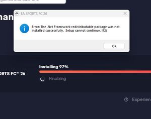 5620233092b9636aNewcomer15 days agoNOT INSTALL FC 26 WHEN 97% DOWNLOAD Help me, please ! When I download FC26 in EA app, when 97% download, EA app noticed : the .net framework redistributable package was not installed successfully. How to fix ? May help me ? Show More