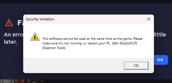 there is a conflict between the game's anticheat and that software listed in the error (DiscSoftLTD Daemoin Tools). In Order to play the game, you will have to deinstall that software, there is no way around it.