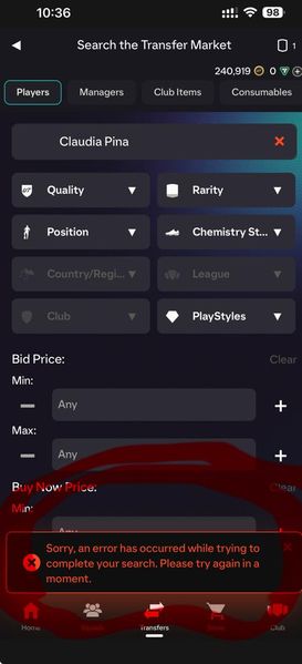 Hey, I'm having some issues with my transfer market. I got a message saying it's open, but whenever I try to access it or search for a player, I get an error 😕. The error message has been attached below. I've checked my console, and it says the transfer market is locked. I've reached out to the help center twice, and they keep telling me to wait a few hours for it to sync, but it's been days and nothing's changed. Their support hasn't been very helpful so far. Can someone please help me out with this? 🙏