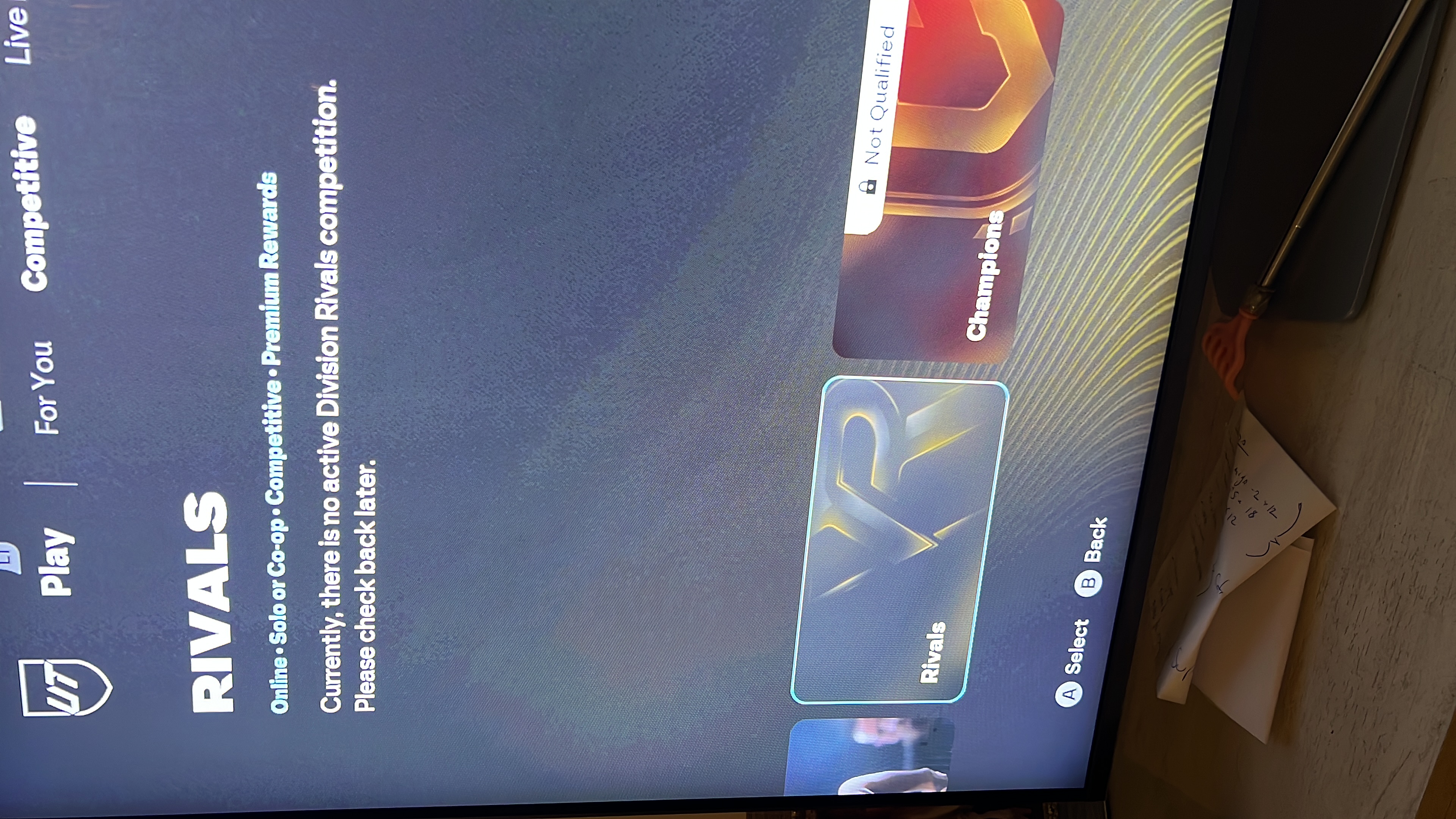 as of tonight I'm not able to play Rivals (as provided in the screenshot). For some reason I get the following note: "Currently, there is no active Division Rivals competition. Please, check back later.