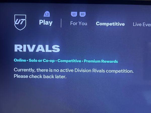 Hi I play on ps5 username Kwhyte42 or Ea name is hhhhhhh656543 sorry bout the name aha but my problem is division rivals it says “currently, there is no active Division Rivals competition. Please check back later.” It’s been like this all day whilst everyone else is playing can you help me sort it out pls