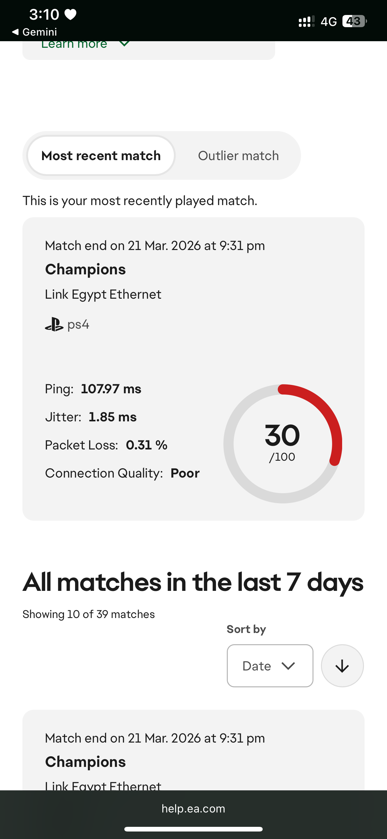 For a long time, I was consistently connected to the Middle East servers (Dubai/Jeddah), providing a smooth gameplay experience with low latency (46-50 ms), I attached a screenshot below showing last games report from ea.