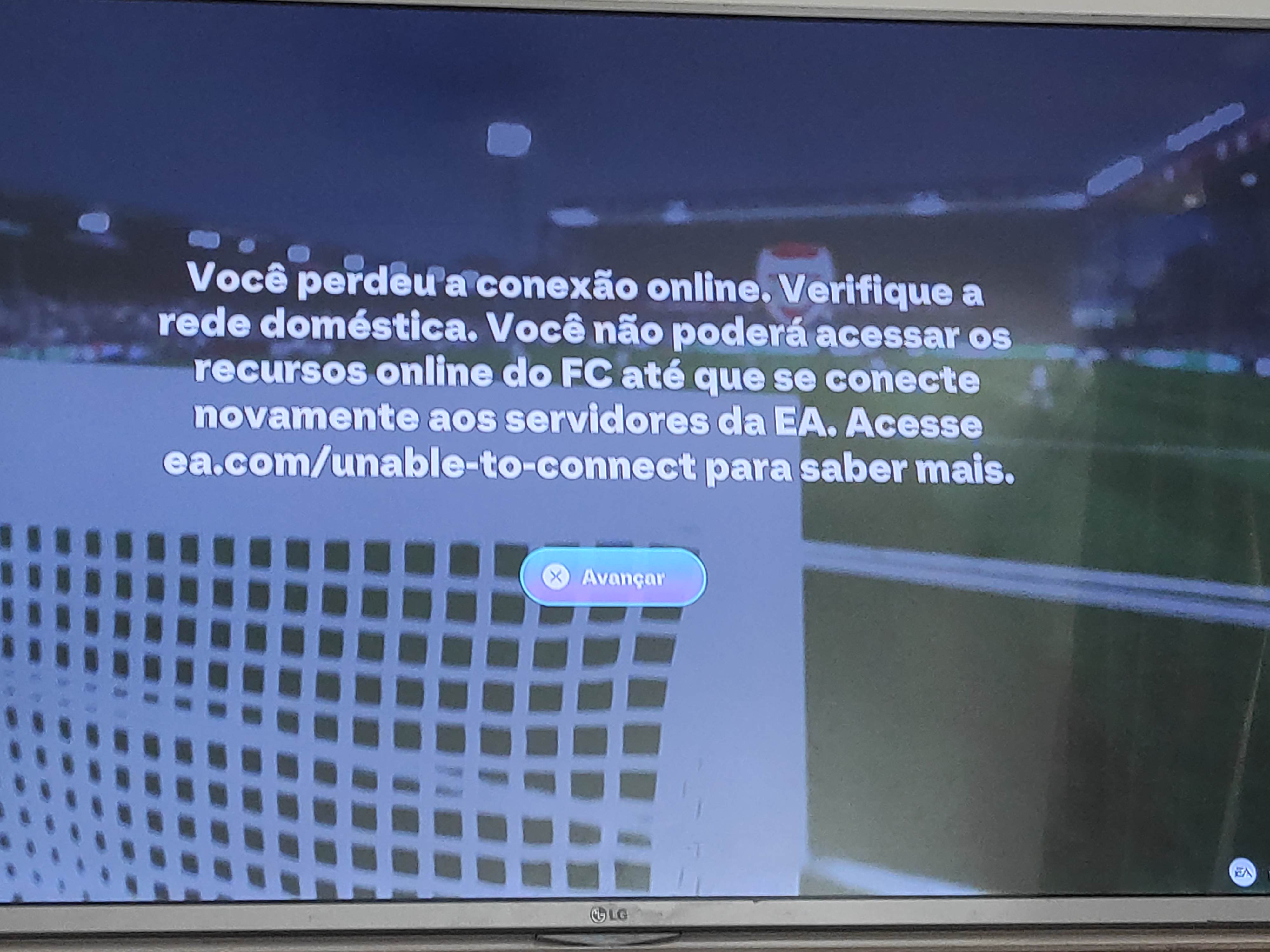 Toda vez que início uma partida online o servidor me derruba com a mensagem: você perdeu a conexão online. Verifique a rede doméstica. Você não poderá acessar os recursos online do FC até que se conecte novamente aos servidores da EA. Acesse es.com/unable-to-connect para saber mais. Porém o erro só ocorre ao iniciar as partidas do FC 26, nenhum outro recurso online apresentar problema no FC 26. Não existe nenhum problema com minha conexão e rede doméstica. E o problema só o ocorre no FC26.