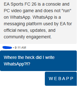 [I hope people here can help me better than "EA Customer Service", as they can't even tell the difference between WebApp and WhatApp...]
