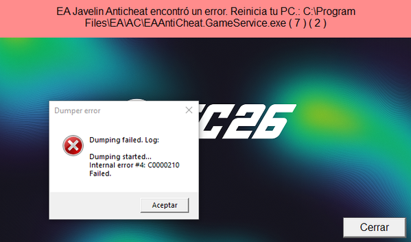 Buenos dias presento el siguiente incoveniente al intentar iniciar ea fc 26, he realizado de toda reinstalo el anticheat, desactivo el antivirus, he desistalado el juego y vuelto a instalar, las aplicaciones de steam y ea tambien. Pero aun no encuentro solucion cabe destacar que el juego me estaba funcionando bien con anterioridad. Subo una captura de pantalla con el error.
