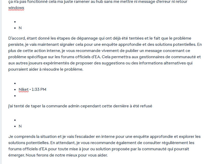 Bonjour à tous cela fait deux jours que je ne parvient plus à lancer le jeu j'ai contacter l'assistance en vain car aucune de leurs solution ne fonctionne ... Je vous mets ma conversation avec en espérant que l'un de vous saurais m'aider à régler mon problème