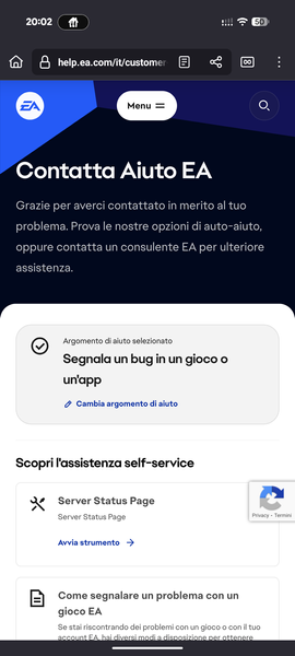 Prova a selezionare Consigli per la risoluzione dei problemi o guide tecniche piuttosto che Segnala un bug, oppure a inviare la pratica da una pagina di navigazione in incognito, senza effettuare l'accesso con il tuo account EA.