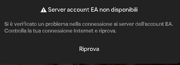 Siamo spiacenti,sembra che i server EA siano fuori servizio, stiamo lavorando per risolvere il problema. Per ulteriori informazioni consulta il sito ea