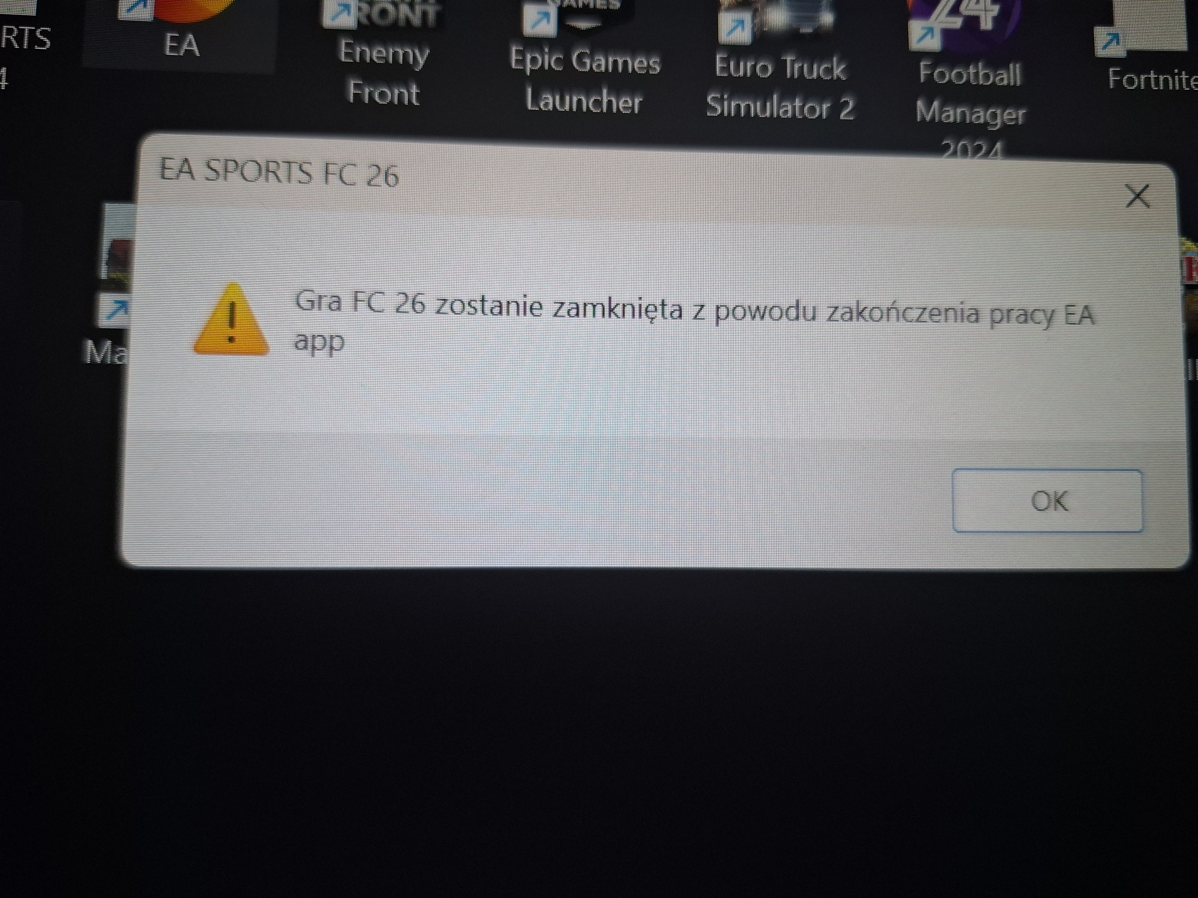 Dzięki za screen. Ten komunikat oznacza, że EA app zamyka się w tle, a wtedy gra automatycznie też jest zamykana – to nie jest błąd samej rozgrywki. Na początek zrób proszę to: