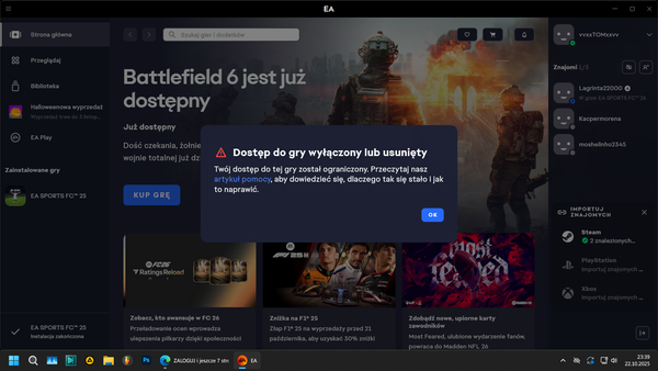 Dziękujemy za wasze zgłoszenia odnośnie gry EA SPORTS FC 26, która zniknęła z Waszego konta.