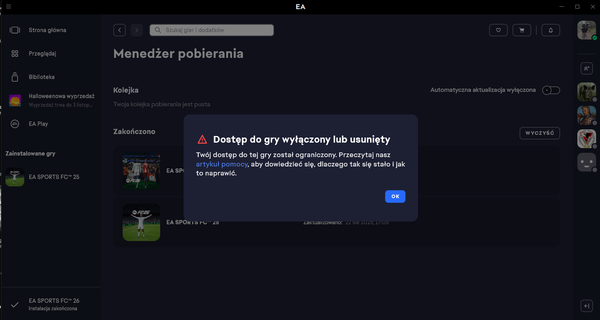 Dziękujemy za wasze zgłoszenia odnośnie gry EA SPORTS FC 26, która zniknęła z Waszego konta.