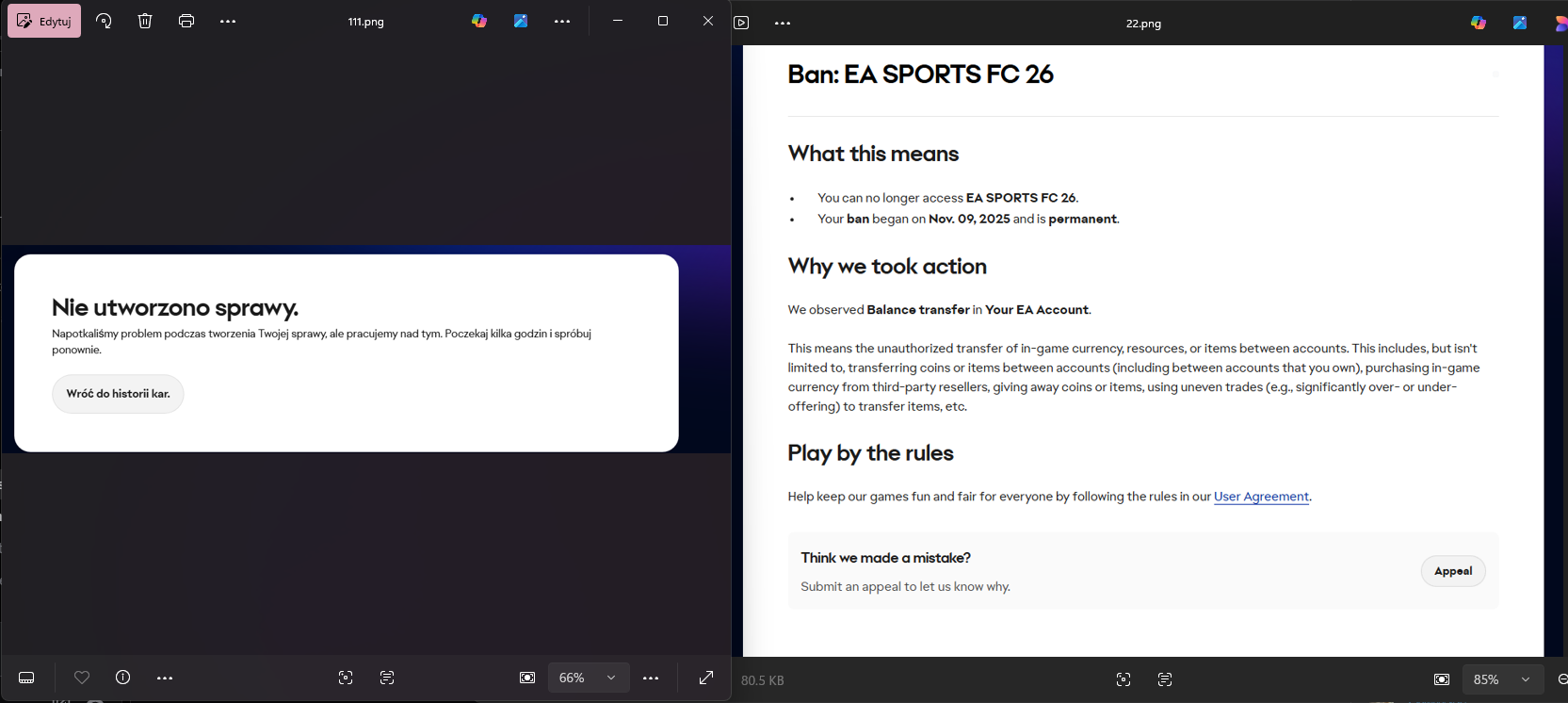 Zwracam się z prośbą o ponowne przeanalizowanie decyzji o nałożeniu blokady na moje konto EA SPORTS FC 26 z powodu rzekomego przekazywania środków.