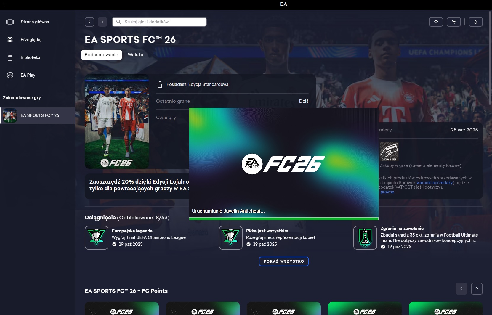Witam, po zrobieniu aktualizacji w windows 11 na najnowszy mam problem z odpaleniem gry FC 26 testowałem już dużo sposobów poprzez usuniecie aplikacji EA i fify i zainstalowaniu ponownie wyłączenie windowsa defender, izolacji pamięci , naprawienie w programie EA/AC "EAAntiCheat.Installer". Problem polega na tym gdy odpalam gre w aplikacji EA gra się ładuje wyskakuje okienko z grą na dole trwa napis: "Uruchamianie Javelin Anticheat..." potem "Uruchamianie gry.." i za kilka sekund wyrzuca mnie znów do aplikacji EA, przywracałem nawet poprzednią wersję windowsa w opcji "Wróć" w ustawieniach ale to nic nie dało jeśli ktoś ma taki problem lub uporał się i podzieli się jak to naprawić będę naprawdę wdzieczny.