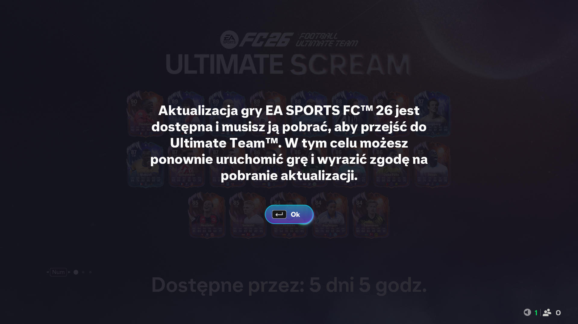 Gdy wlaczam gre moge grac np kariere, szybkie mecze itp. Natomiast gdy chce zagrac w Ultimate Team wyskakuje mi ze wymagana jest aktualizacja ,ale nie mam zadnej dostepnej aktualizacji. Kolega mowil mi ze trzeeba cos zmienicv w ustawieniach sieciowych ale niee pamieta co. Gre mam na steam. PROSZĘ O POMOC.