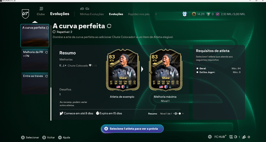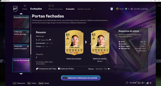 Comprei o EA FC 26 na semana passada, e ao começar a fazer os objetivos do UT, mais especificamente o desafio 'Hora de desbravar' > 'Conclua a EVO de Fundamentos'. Concluí a EVO, mas ao final da partida o servidor caiu. Após logar novamente, a EVO foi resgatava, porém, o objetivo não foi concluído. Tentei fazer novamente a EVO, e para minha surpresa, o objetivo novamente não foi concluído. Segue imagens do objetivo, dos jogadores que a EVO foi aplicada e da minha teça de evoluções, mostrando que não há mais Evolução de Fundamentos para ser feita: