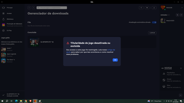 - No EA App, vá em "Biblioteca" > clique com botão direito em EA FC 26 (se aparecer) > "Reparar" ou "Verificar arquivos".
